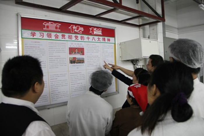 为了更好让广大员工共同学习领会党的十八大报告的精神要点,更好提高思想认识来做好企业的餐饮接待服务工作,支部还在员工饭堂办了十八大精神的专题宣传墙报,丰富了员工们的精神食粮。